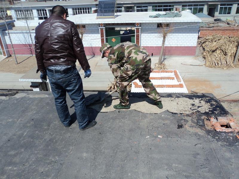 在填补的水泥干了之后,在加入抗渗补漏剂泼洒到屋面,然后用木板,刮板等推开,覆盖使整个屋顶。